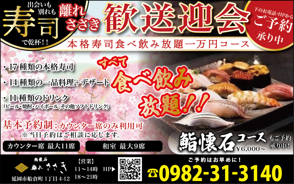いよいよ歓送迎会の季節となりました。 当店では職人が握る17種類の本格寿司と14種類の一品料理をすべて「食べ飲み放題」でお愉しみいただける一万円コースのご予約を承っております。